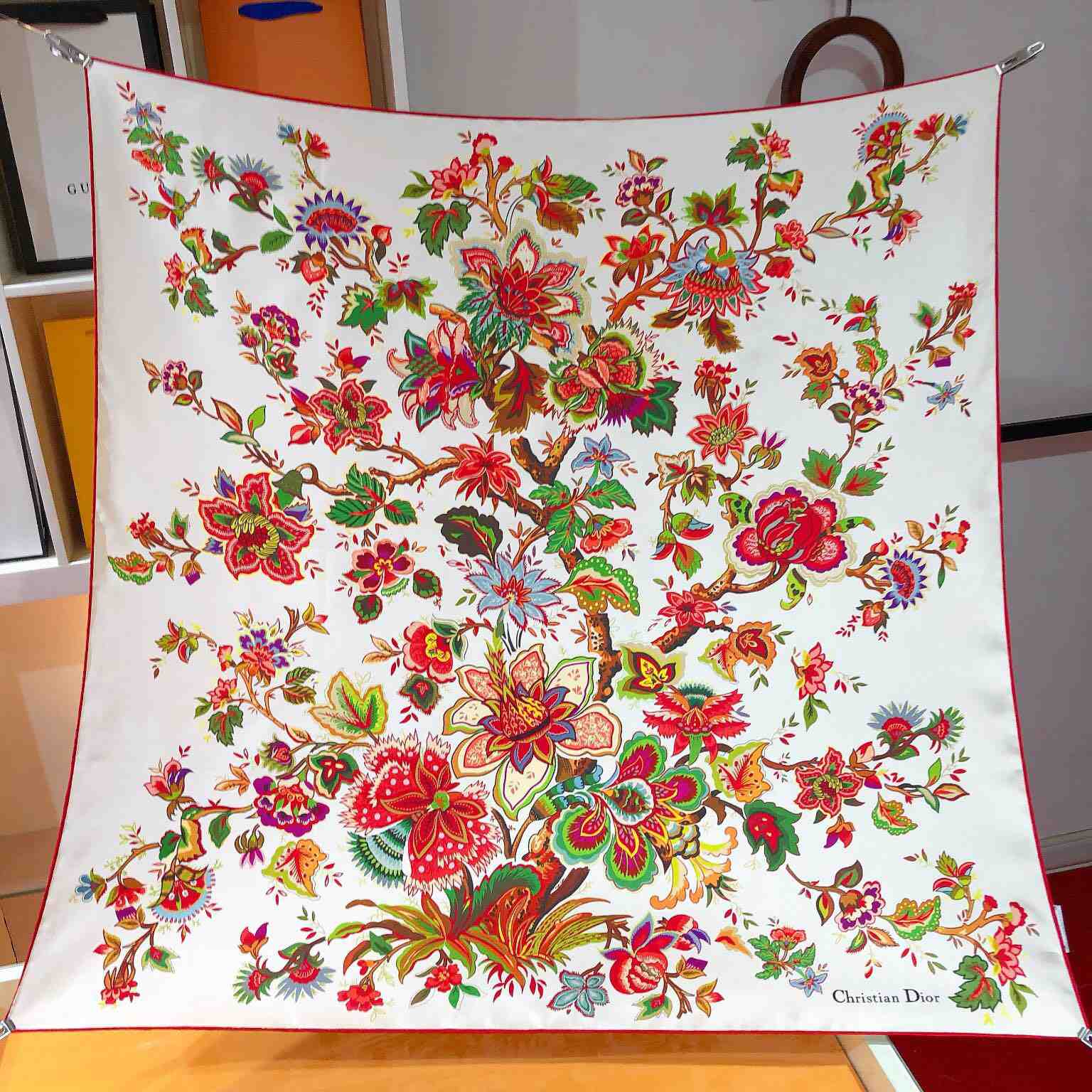 The Albero della Vita square scarf honors Mr. Dior's passion for nature in a poetic representation of the tree of life. Crafted in off-white multicolor silk twill, the double-sided style features contrasting hand-rolled edges and is enhanced by the Christian Dior signature. The scarf can be worn around the neck or head to complete the Dior look.