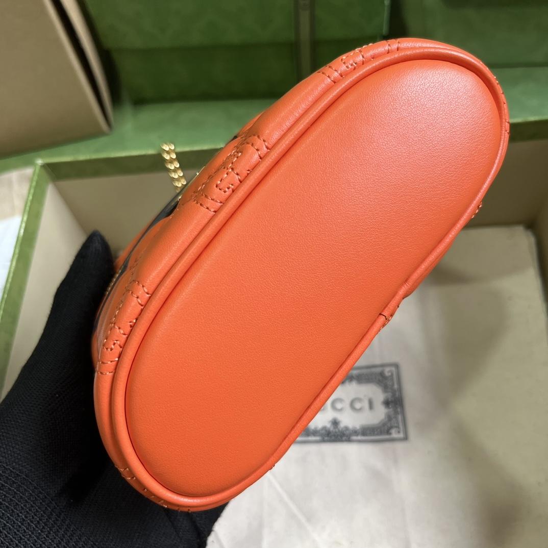 Defined by a textured geometric version of the House emblem, the GG Matelassé leather has come to enrich a series of signature small leather goods. This top handle mini bag with a chain shoulder strap is brought to life by a vibrant orange shade of the now-renowned material.