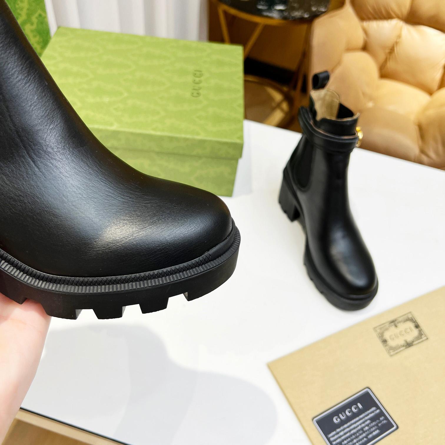 Style 730064 AABK6 1000Crafted from shiny black leather, this pair of ankle boot's minimalist design draws attention to the House's logo. The style reimagines the classic Chelsea boot through a lug sole and defined block heel.