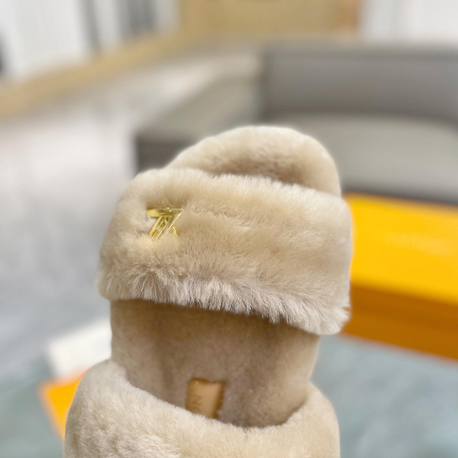 The LV Sunset flat comfort mule is crafted from fluffy shearling for ultimate softness and comfort. Ideal for travel and both indoor and outdoor wear, this on-trend model features two straps: one adjusted with velcro, the other embellished with a gold-tone LV accessory. An anatomic insole and lightweight micro outsole complete this design.
