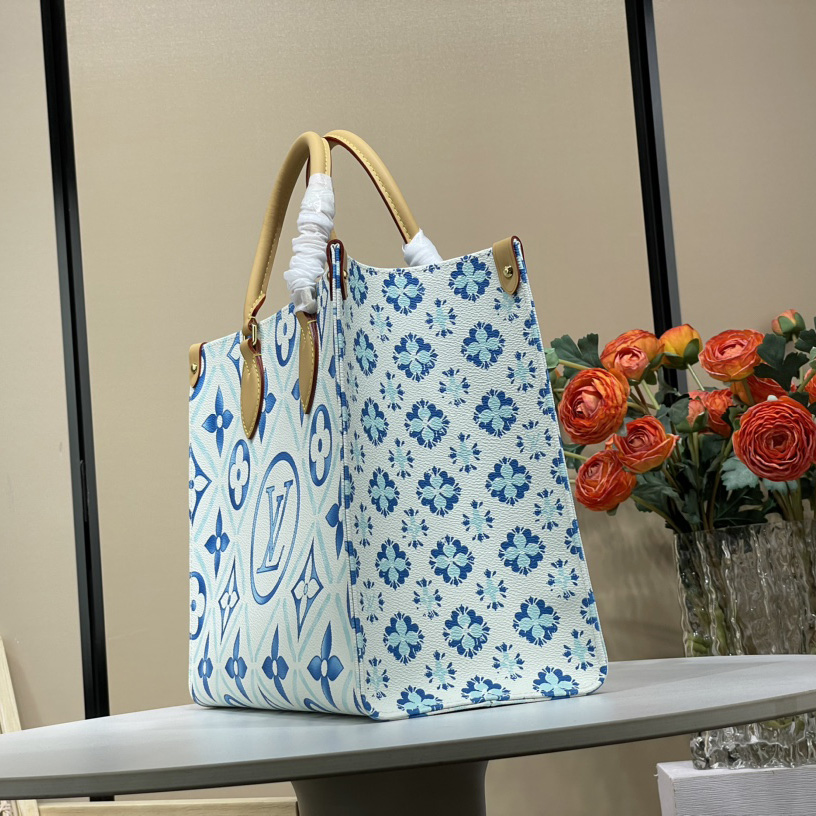 This OnTheGo MM tote is made from Monogram Tiles canvas, with its watercolor-style Monogram print and LV Circle centered on the bag. The two top handles, and concealed shoulder straps, are in cowhide leather, as are the four riveted corner tabs. This roomy bag can easily carry a laptop as well as other daily necessities.